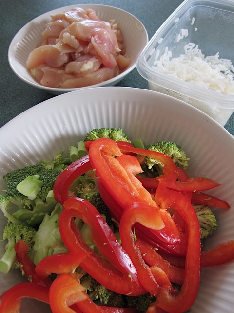 This week I was glad that I had a well-stocked pantry and a well-stocked freezer. I had worked outside all day and all of a sudden it was time to make dinner! In a matter of minutes I had decided to cook a quick stir-fry. I checked the drawers in the fridge and found some broccoli, scallions and a half of a red pepper. Garlic and ginger I had on hand. There was some leftover rice and chicken in the freezer.
