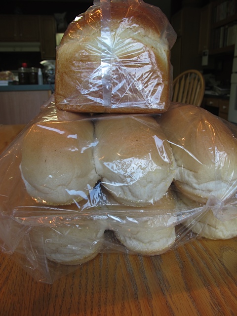 Last Thursday I saw on FreeCycle that someone was looking for rhubarb! They just wanted to come harvest what I didn’t want. After a few emails back and forth it was set up that the woman’s husband would stop by on Saturday to pick some rhubarb. Oh yes and did I want any bread as she’d love to barter! I wasn’t expecting anything but after her husband had picked a large bunch of rhubarb we had two loaves of French Bread, two packages of large grinder rolls, a package of sandwich rolls and a loaf of sandwich bread for the freezer! I just love bartering!