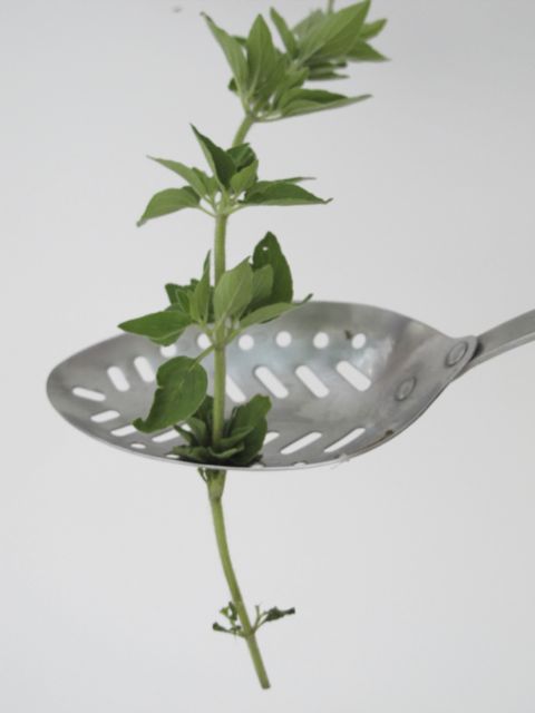 I used to hand pick the herb leaves from their stems, which was slow work and often inefficient. Then I discovered that I could use my slotted spoon! Turned out to be the perfect tool for the task.