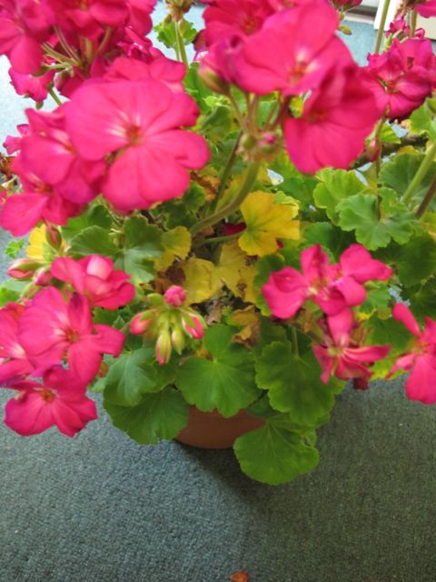 I cut the blooms off to help it adjust to life inside. It is natural for it to have a bit of a shock with less light and humidity than it was used to outside. Once it has adjusted it will bloom again and give us some color over the long winter months.