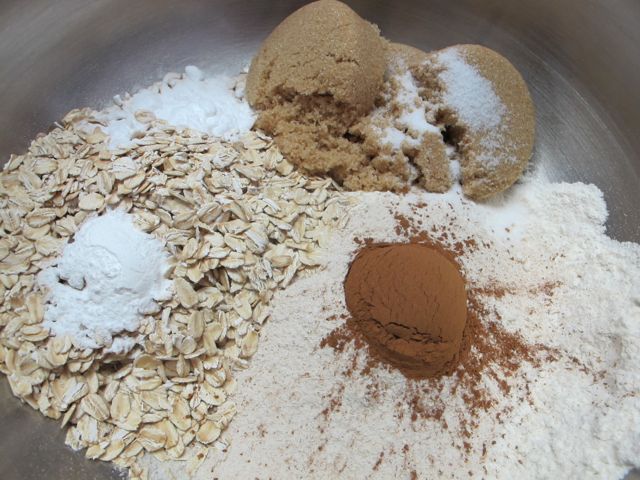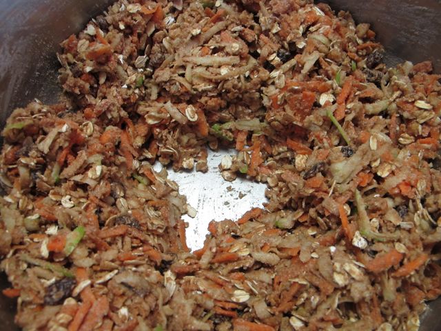 Add the apples, carrots, walnuts and raisins to the dry mixture. Stir to coat and make a well in the center of the mixture.