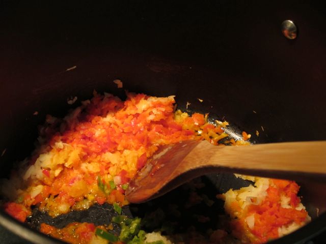 Place the onions and red pepper in a food processor and pulse until just chopped. Heat the oil in a Dutch oven over medium heat. Add the onion pepper mixture and cook stirring, until soft, about 5-7 minutes.
