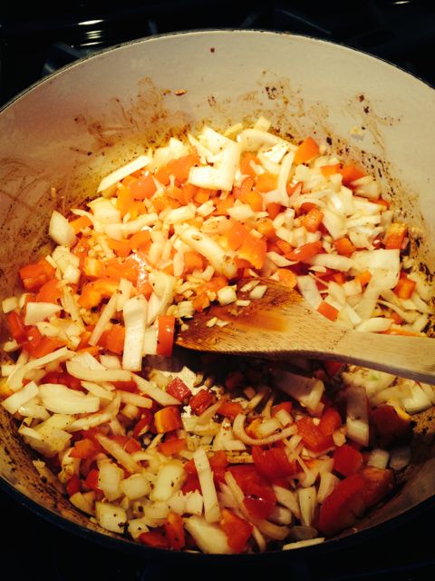 Remove the pork from pan and set it aside. Add the remaining 1 tsp of olive oil to the pan and sauté the onion, pepper and garlic until tender, about 5 minutes.