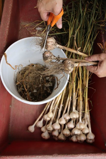 First step is to brush all the dirt off the garlic and cut the roots off. You can use a toothbrush if you are picky about getting the dirt off. As you will see from my pictures I get most of the dirt off but not all.