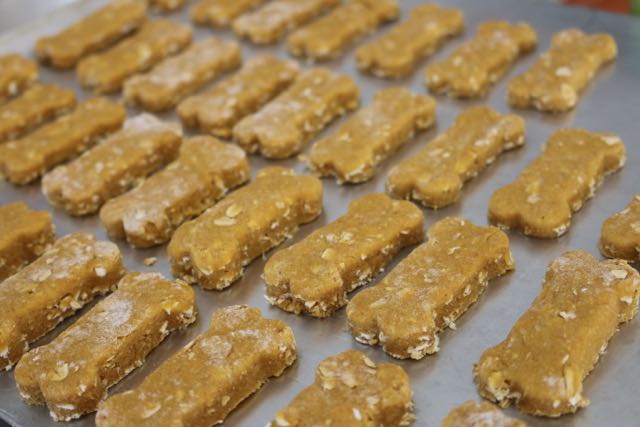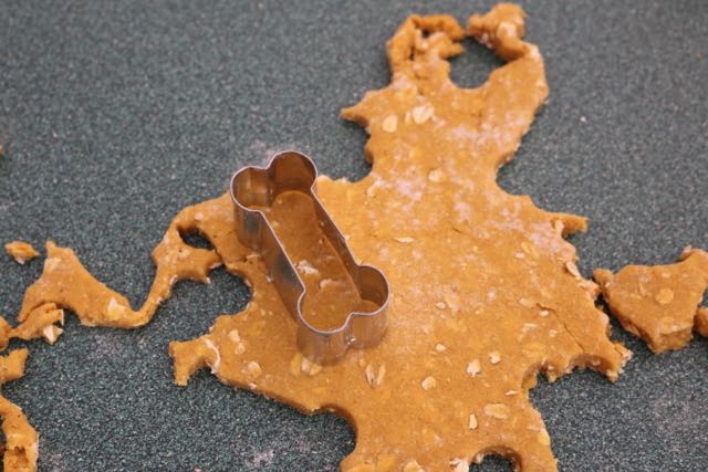 Knead the dough on a floured surface and roll out to an inch thickness. Cut your shapes out. I used a bone shaped cookie cutter.
